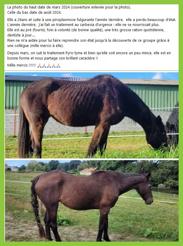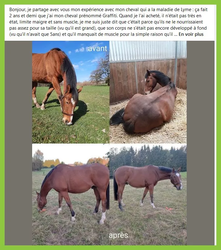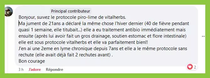 Le mélange va être donné après l'affection (lyme/Piro) afin de restrouver un bon état général et augmenter l'énergie vitale auprès des chevaux aux organes affectés , retrouver rapidement un bon état de santé. Le mélange va donner un confort optimal après 15/25 jours, à donner pendant 2 mois, l'effet continue quelques semaines après l'arret du mélange. Le mélange peut être renouvelé à chaque saisons si nécessaire ou être donné à plein temps avec 1 semaine de pause par mois. Synergie de plantes médicinales aux propriétés réputées anti bactériennes sur les borrélioses.